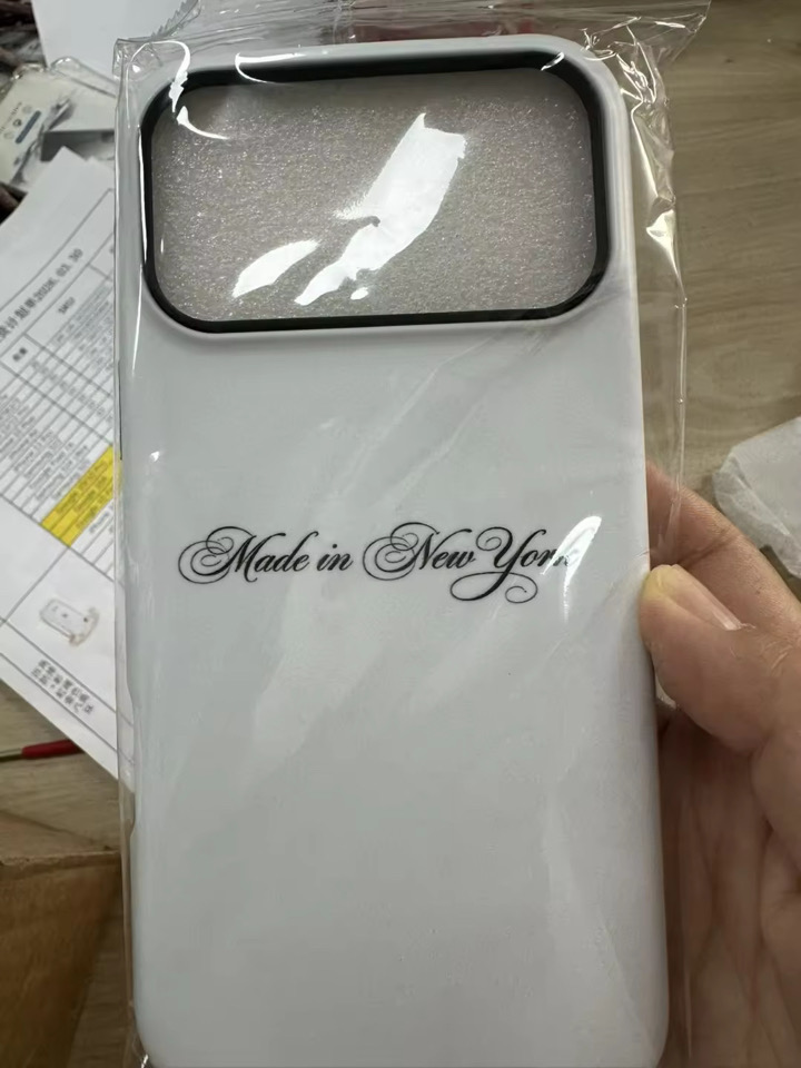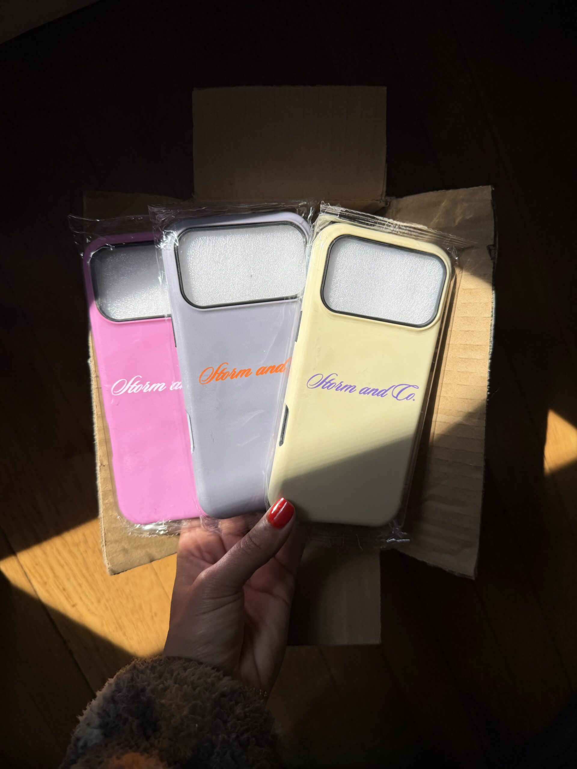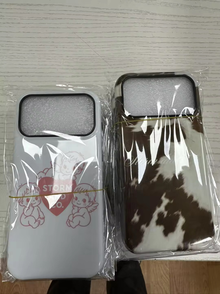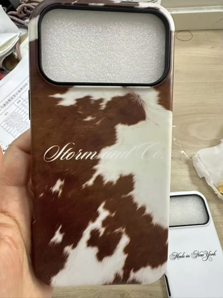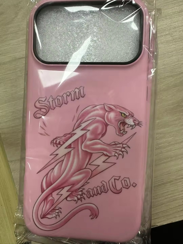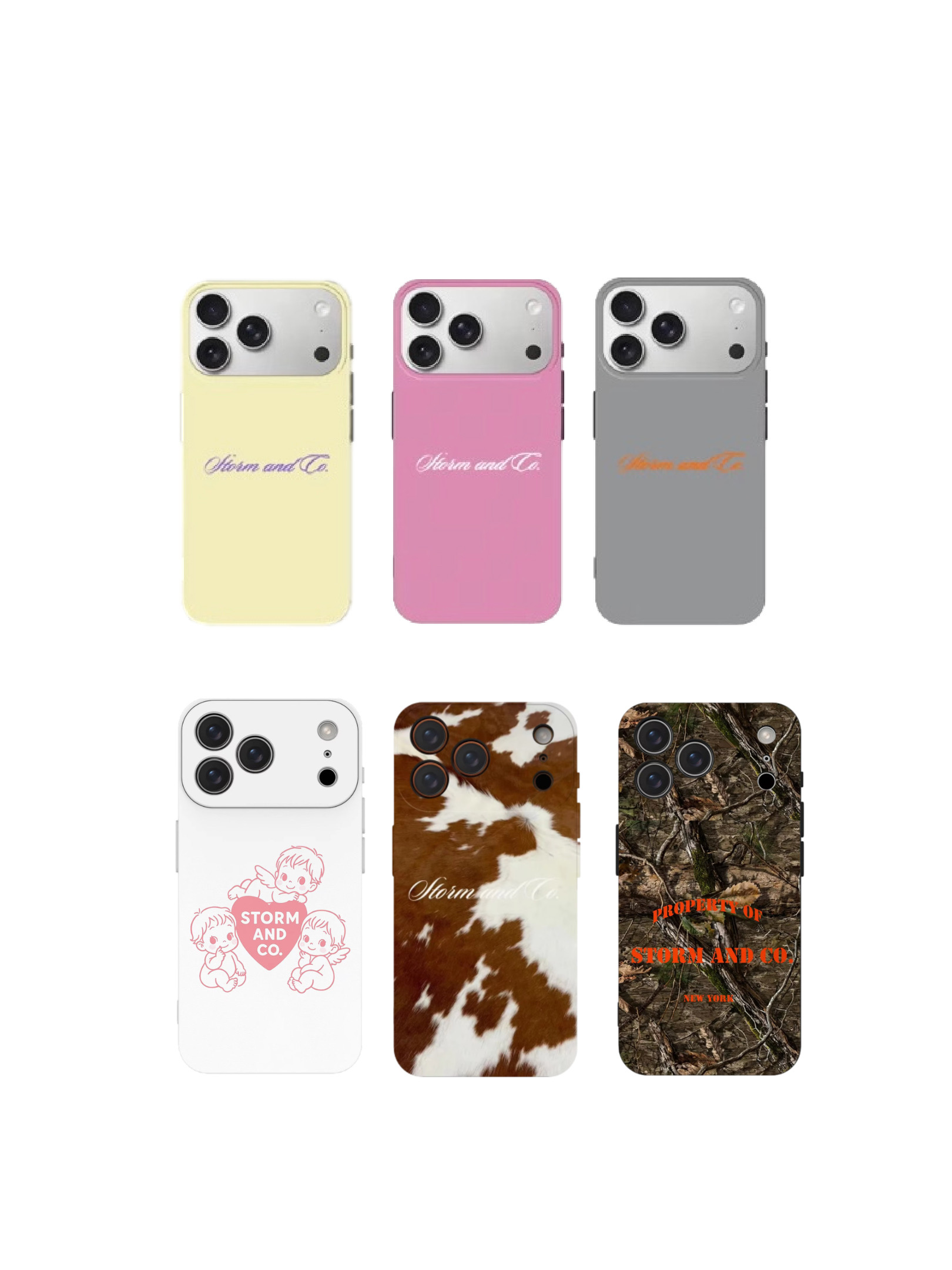 PINK CHERUBS, PINK PANTHER, BUTTER YELLOW ( purple font ), GRAY ( orange font ), PINK ( white font ), MADE IN NEW YORK ( matte finish ), COWHIDE LOGO CASE
